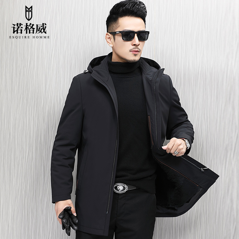 商品名称:兔毛内胆尼克服男连帽中长款中年皮毛一体商务休闲皮草大衣派克服